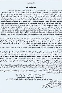 في بيان صادر عنها…..احزاب مأرب ترفض تشكيل مايسمى المجلس الاعلى للمقاومة الشعبية وتؤكد دعمها لمجلس القيادة الرئاسي