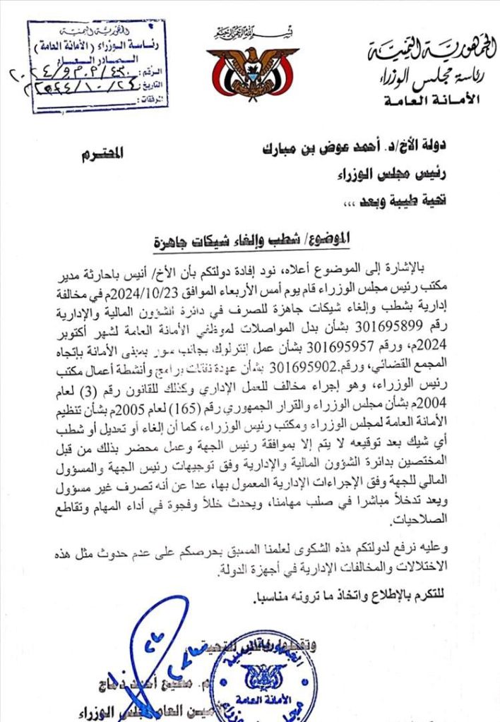 كشفت وثيقة جديدة اسباب لجوء امين عام مجلس الوزراء مطيع دماج للتحقيق في اختفاء شيكات من مكتبه عقب توجيه رئيس الوزراء احمد عوض بن مبارك بالغاء ختم رئيس الجهة في مخالفة قانونية جسيمة حسب مستشارين قانونيين.