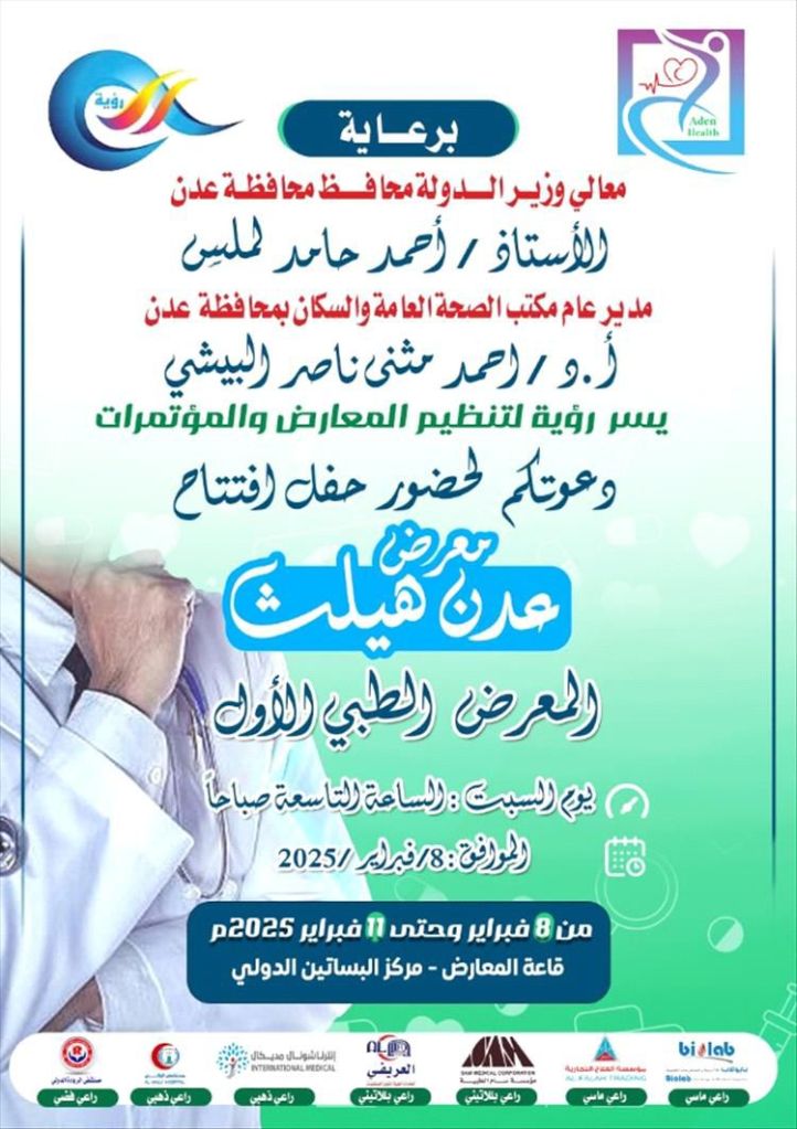 برعاية معالي وزير الدولة محافظ محافظة عدن الأستاذ أحمد حامد لملس، وبإشراف مدير عام مكتب الصحة العامة والسكان بمحافظة عدن أ.د. أحمد شني ناصر البيشي، تنطلق فعاليات معرض “عدن هيلث” والمعرض الطبي الأول، الذي تنظمه رؤية لتنظيم المعارض والمؤتمرات.