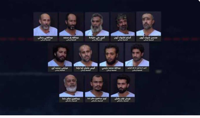 ٠ أورد أسماءهم وفق الجوازات ورخص البحرية التي يحملونها وهم: #الإيرانيون: عبدالغني عبدالله رساني، عبدالله بار محمد، اسلم كشوك أرون، محسن شيرك أرون، مرتضى محمد آين، أنيس عثمان أربا تزادا، عبدالله محمد رئيسي، أمين إسماعيل نزار كوهين. والباكستانيون: عبدالله صالح دادا، أوزيز عبدالعزيز صالح دادا، فرحان قادر باكش.