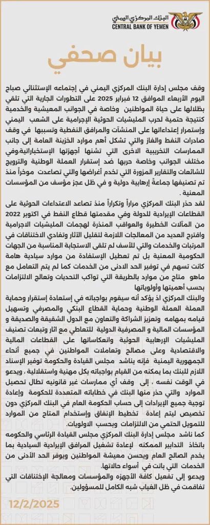 كما ناشد مجلس إدارة البنك المركزي مجلس القيادة الرئاسي والحكومه باتخاذ التدابير الممكنه لإعادة تشغيل المرافق الإيرادية السيادية بما يخدم الصالح العام ويحسن معيشة المواطنين ويوفر الحد الأدنى من الخدمات التي باتت في أسواء حالاتها.