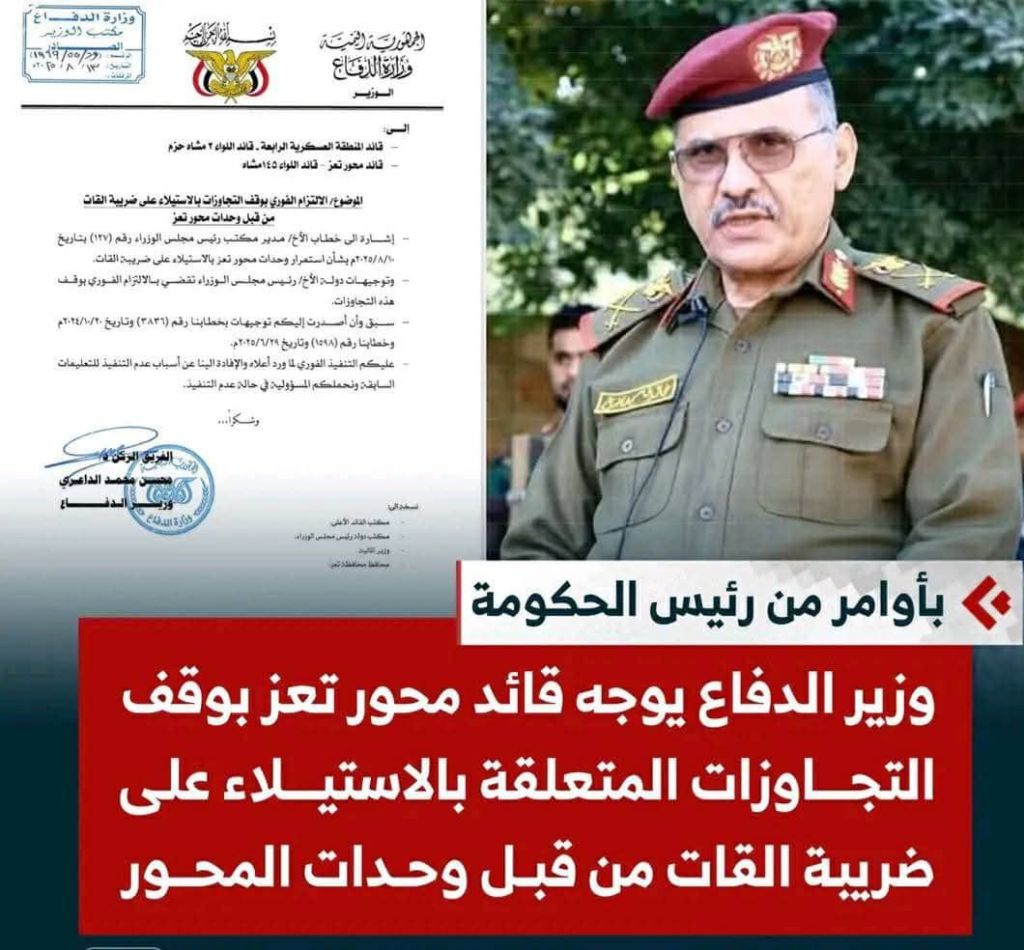 وتبرز هذه الاختلالات في عدم التزام قيادة محور تعز والألوية العسكرية بمضمون قرار مجلس القيادة الرئاسي رقم (11) لسنة 2025م والمتعلق بتنظيم الموارد المحلية، وفي مقدمتها ضريبة القات.