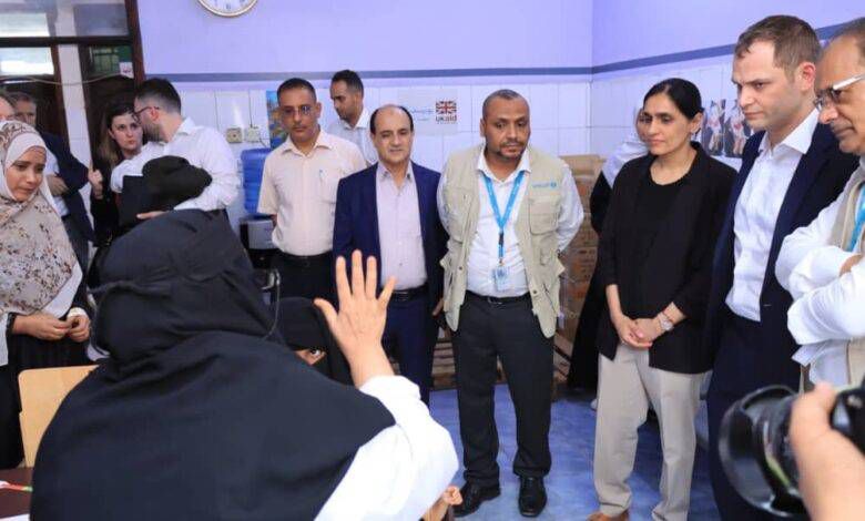 وفد رفيع من الخارجية البريطانية واليونيسف يزور مجمع دار سعد الصحي للاطلاع على مستوى الخدمات الصحية بالمديرية