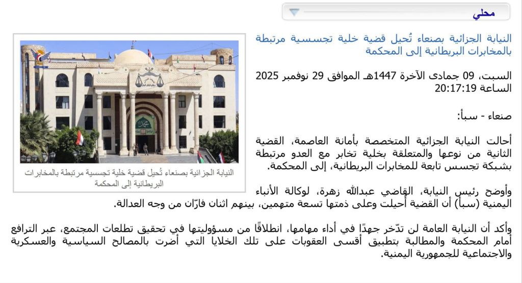واوضحت الشبكة ان النيابة الجزائية المتخصصة قامت بتاريخ 29 نوفمبر بإحالة تسعة مواطنين جدد إلى المحكمة بتهمة التخابر مع المملكة المتحدة، وذلك بعد أسابيع قليلة من إصدار أحكام بالإعدام ضد سبعة عشر شخصاً في ما يسمى بقضية “غرفة العمليات المشتركة”.