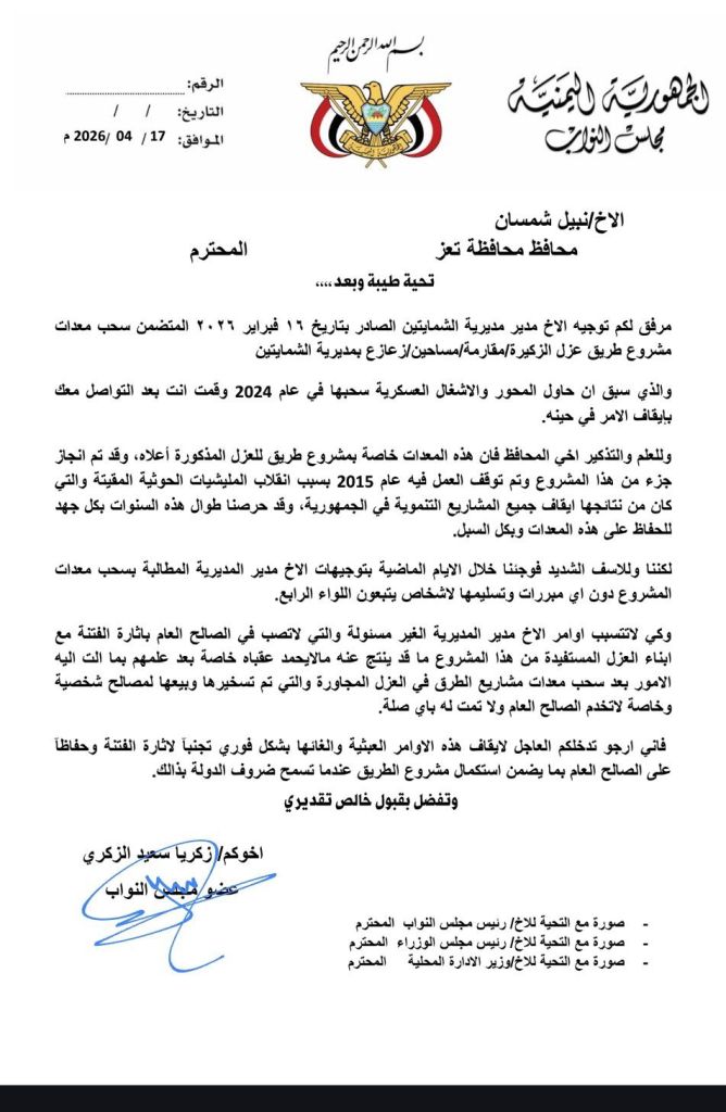 وعبر البرلماني الزكري عن تفاجئه من صدور توجيهات جديدة من مدير مديرية الشمايتين بتاريخ 16 فبراير 2026، تطالب بسحب المعدات وتسليمها لأشخاص يتبعون اللواء الرابع دون مبررات قانونية أو فنية واضحة، واصفاً هذه الأوامر بـ “العبثية” وغير المسؤولة.