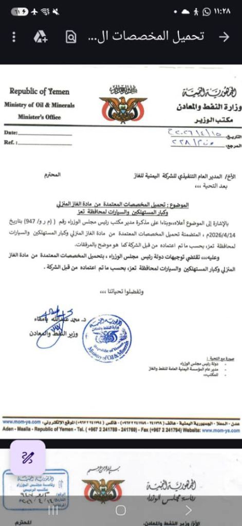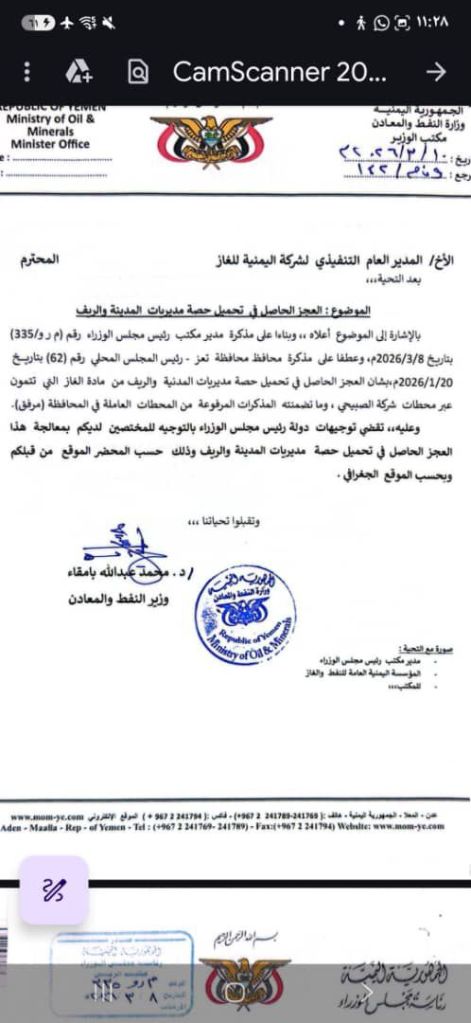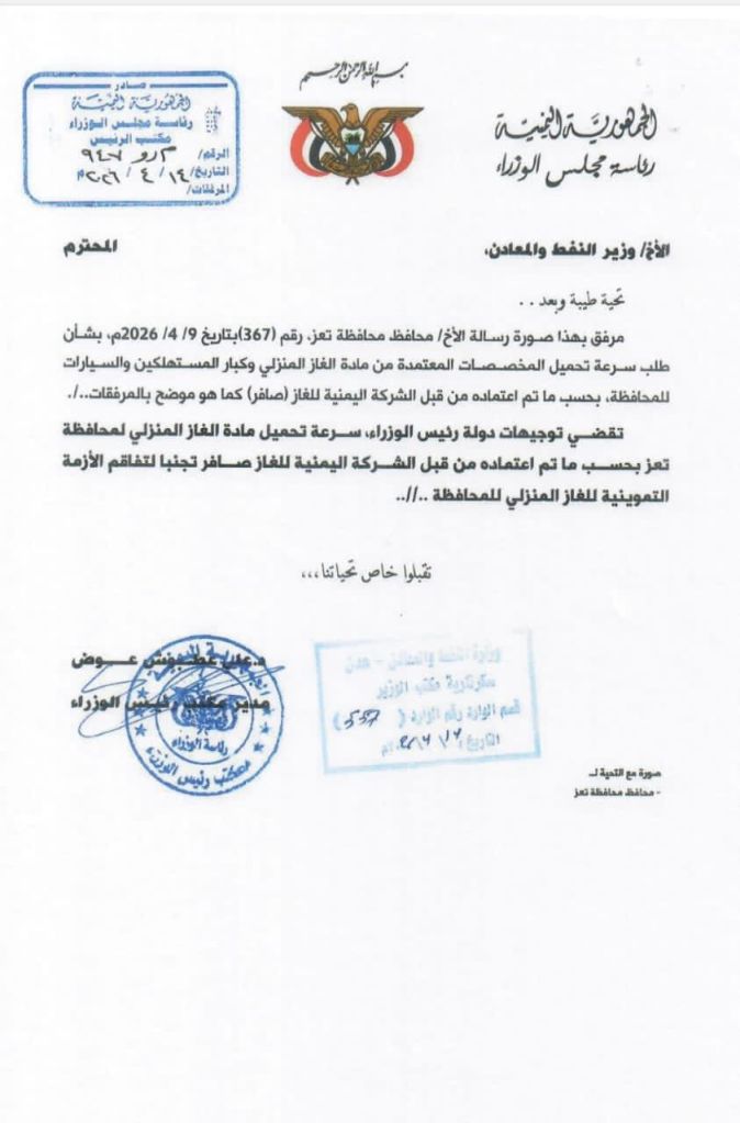 في تاريخ 14 ابريل وجه رئيس مجلس الوزراء مذكرة الى شركة الغاز عطفا على مذكرات من السلطة المحلية تلتها مذكرة اخرى من وزير النفط والمعادن الى قيادة الشركة في 15 ابريل وكل هذه المذكرات طالبت قيادة الشركة سرعة تحميل الحصص المعتمدة لمحافظة تعز لتجنب ازمة تموينية كارثية إلا أن “الشركة اليمنية للغاز” لم تستجب لهذه الأوامر بالقدر الكافي، ليستمر العجز في التصاعد الى اليوم وهو الامر الذي يضع اكثر من علامة استفهام حول الجهة التي تملك سلطة إيقاف هذه الحصص ومنع وصولها إلى سكان المحافظة الأكثر كثافة سكانية في اليمن.