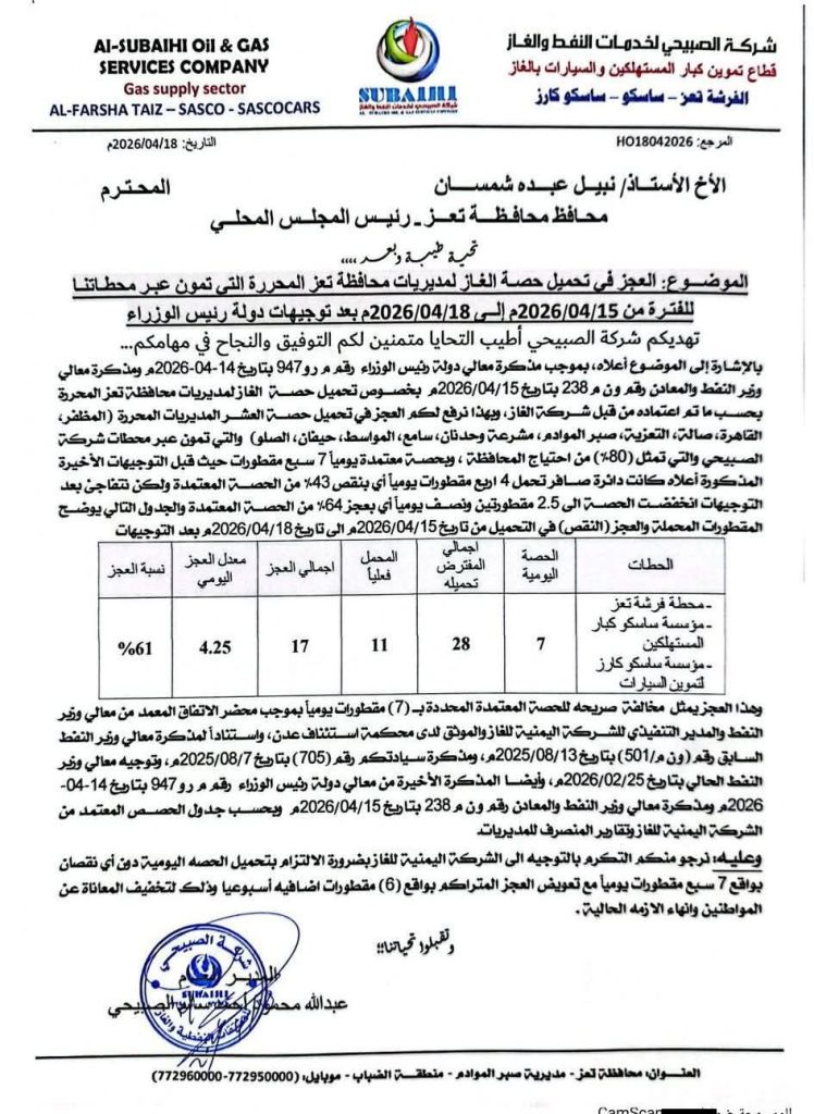 في مذكرة رفعتها شركة “الصبيحي الى محافظ تعز ، أكدت ان (قطاع تموين كبار المستهلكين) وصل الى مرحلة حرجة بسبب تراجع التحميل لحصص مديريات (المظفر، القاهرة، صالة، التعزية، وغيرها).